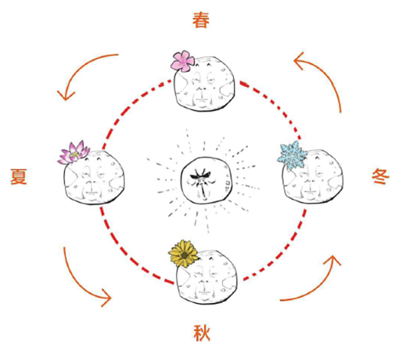 經(jīng)歷了幾個月的浪漫時光,小芳懷孕了,老原不得不開始到處找吃的。可經(jīng)過一場大雪,世界都禿了!他啥也找不著。老原恍然大悟:原來每過三個月就會換氣侯!一共四種氣候,每個循環(huán)要花12個月,于是就把這種循環(huán)叫作——一年。至此,日、月、年都有了,他又總結(jié)三者之間的規(guī)律,這形成了歷法。這個由月亮繞地球12個圈圈所組成的年叫做月亮年,老原開心的把這歷法傳給后代。老原的后代,上至結(jié)婚,下至私奔,都被這歷法安排得明明白白。